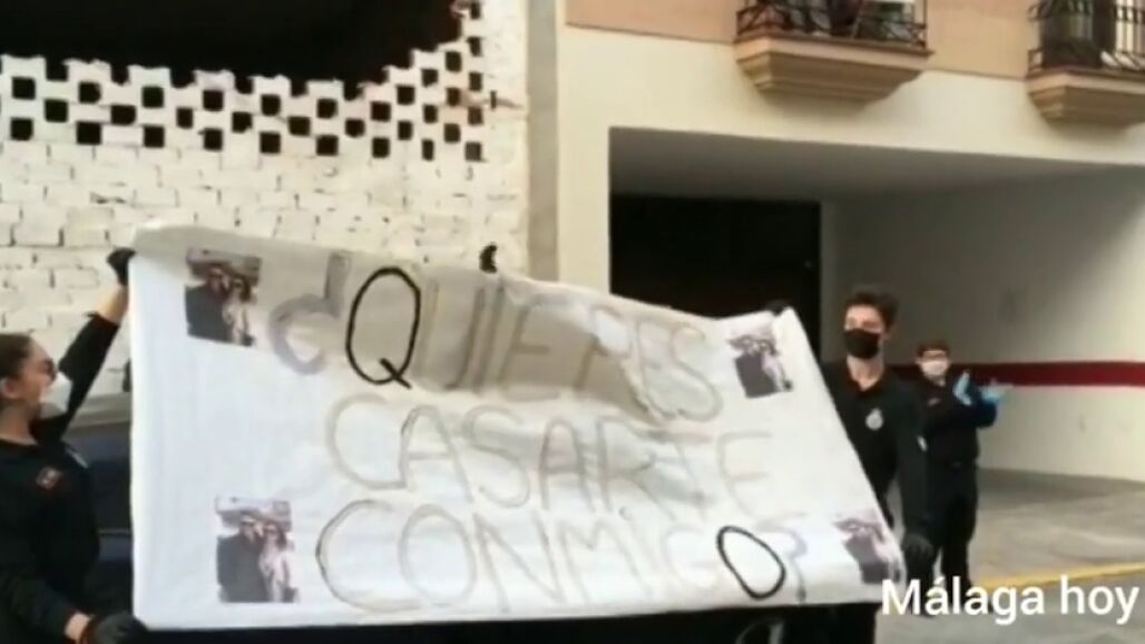 La joven se puso de acuerdo con los vecinos de su calle y lo agentes de Protección Civil para pedirle matrimonio a su pareja. Ambos acordaron contraer matrimonio una vez finalice el confinamiento para frenar el avance del coronavirus. | DIRECTO: Coronavirus Andalucía