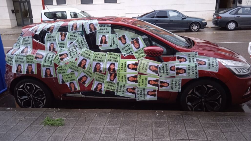 Este martes apareció el coche de la hermana de Óscar, el principal sospechoso de lo que le pudo haber ocurrido a la joven el día de su desaparición. El vehículo, rojo, pequeño y de la marca Renault ha aparecido completamente empapelado por carteles que piden "justicia" para Esther López.