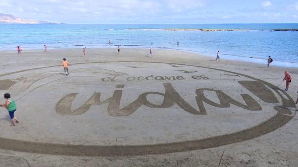 En el Día de los Océanos se defiende un agua llena de vida, un bien común que hay que proteger. En Canarias, un enorme lienzo realizado en la arena por el artista Óscar Rodríguez Vila, reivindica unos océanos con vida y futuro para las próximas generaciones.