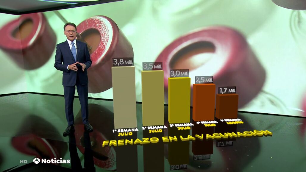 Frena el ritmo de vacunación en España contra el COVID-19. En la primera semana de julio, se ponían más de 3,8 millones de pinchazos. Las cifras han ido descendiendo hasta 400.000 dosis menos por semana.