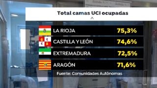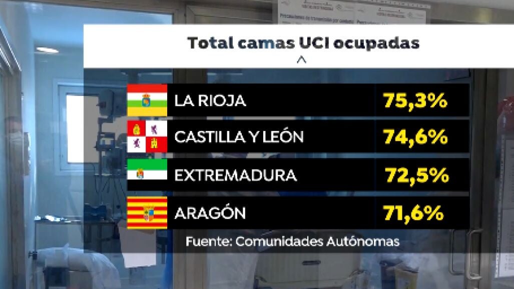 Las camas se agotan en las UCI. De media, en España, según Sanidad, están ocupadas el 42% solo por pacientes con coronavirus, pero "están también los pacientes no covid que también pueden ser críticos" explica una profesional sanitaria. Es decir, si sumamos los enfermos covid y no covid, ese porcentaje de camas ocupadas es mucho mayor. Lo vemos, por ejemplo en la Comunidad Valenciana, 8 de cada 10 plazas tienen pacientes.