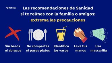 Recomendaciones para evitar los contagios de coronavirus en el ámbito familiar y en la reuniones de amigos. Mantener la distancia de seguridad, nada de abrazos y besos, usar mascarilla y no compartir ni vasos ni platos.