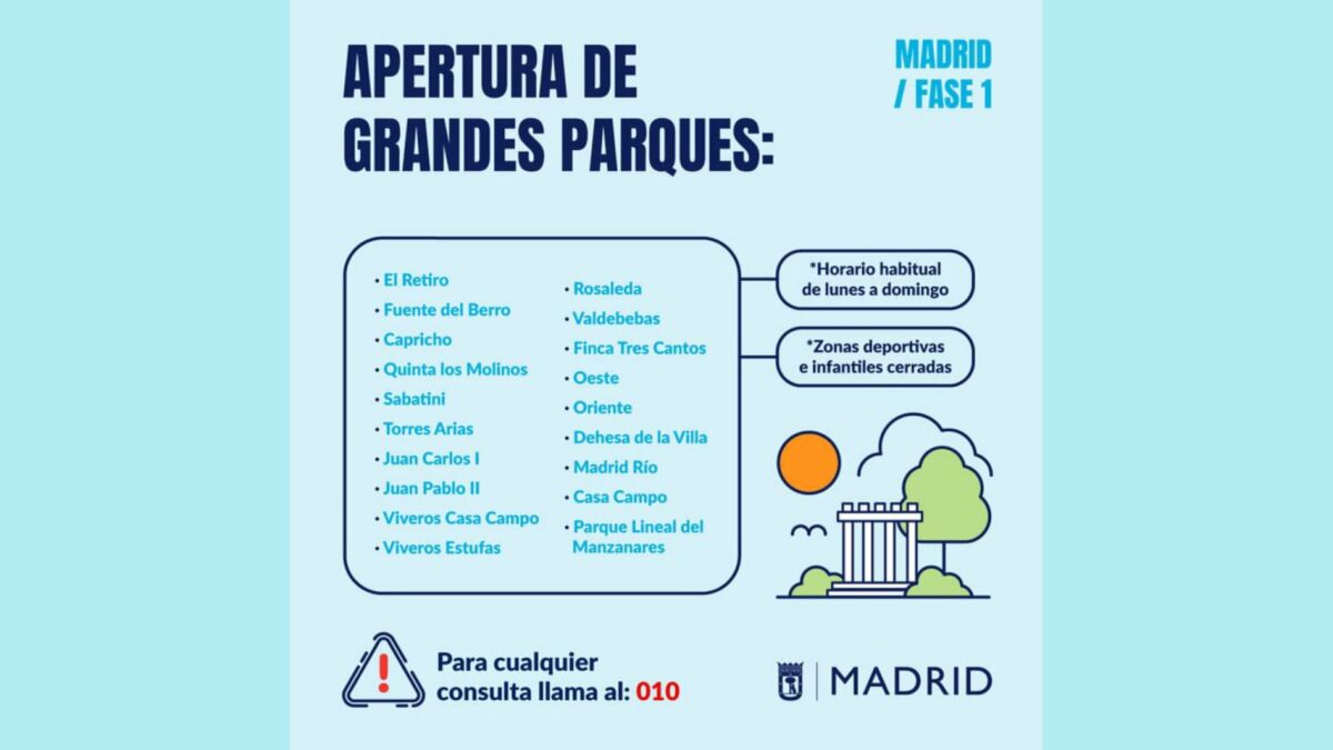 A pesar de ello, las zonas infantiles y las canchas deportivas permanecen cerradas. Desde principios de mayo ya se permitía el acceso a los pequeños parques de barrio. A pesar de que estos parques podrían haber abierto ya, el Ayuntamiento de Madrid ha esperado hasta llegar a la fase 1.