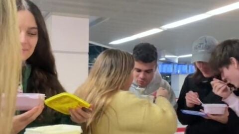 En las imágenes se aprecia como los integrantes del grupo eligen los tuppers y comienzan a comer a toda prisa para no tener que tirar la comida a la basura y para evitar el coste adicional por exceso de peso que imponen las compañías aéreas.