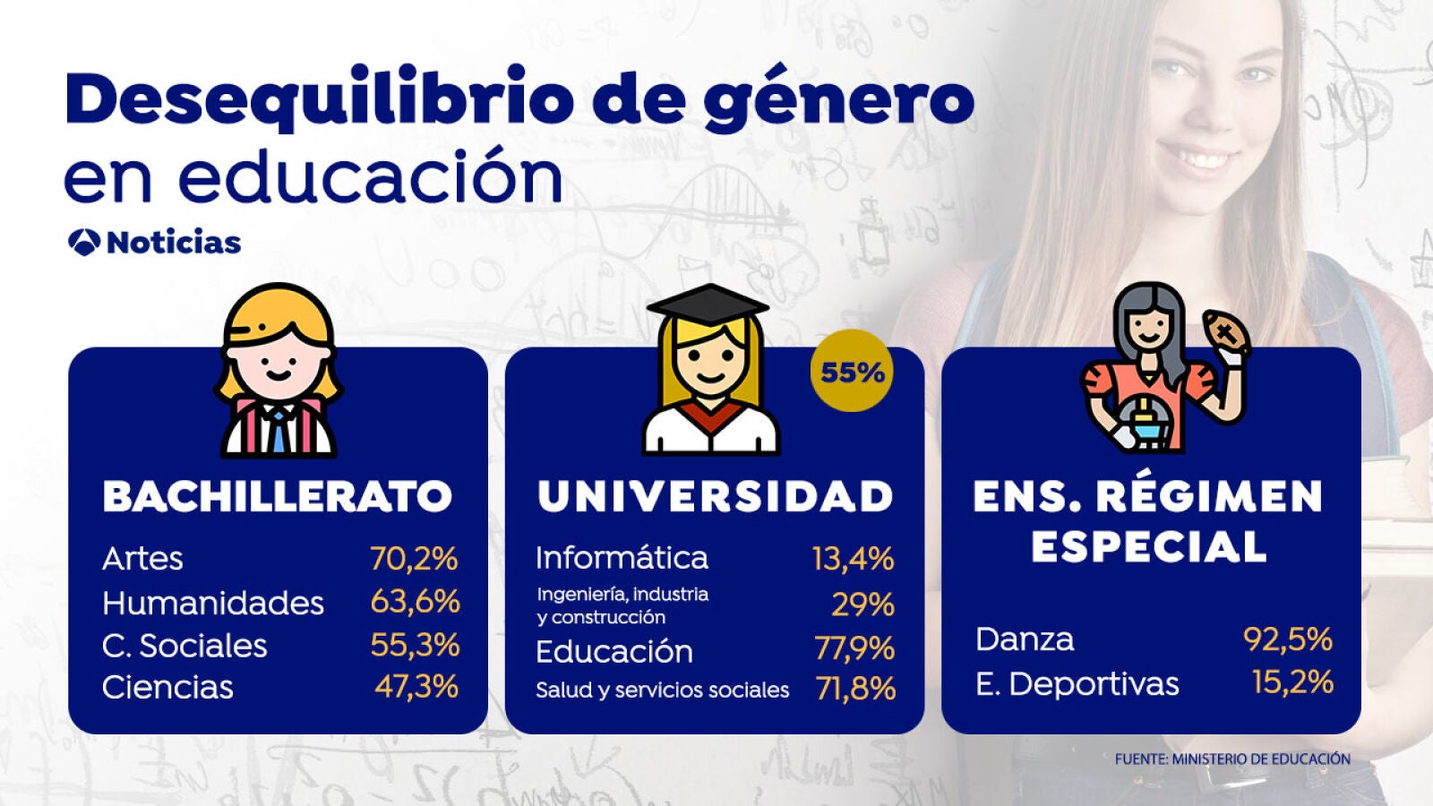 Las mujeres son mayoría en el Bachillerato de Artes (70,2%), Humanidades (63,6%) y Ciencias Sociales (55,3%) y casi la mitad en el de Ciencias (47,3%). En enseñanza superior también son mayoría (55,6%). Sin embargo, la brecha de género principal viene en relación a los estudios en Ingeniería, industria y construcción (29%) e Informática (13,4%). Por el contrario, hay más mujeres matriculadas en Educación (77,9%) y Salud y Servicios sociales (71,8%).