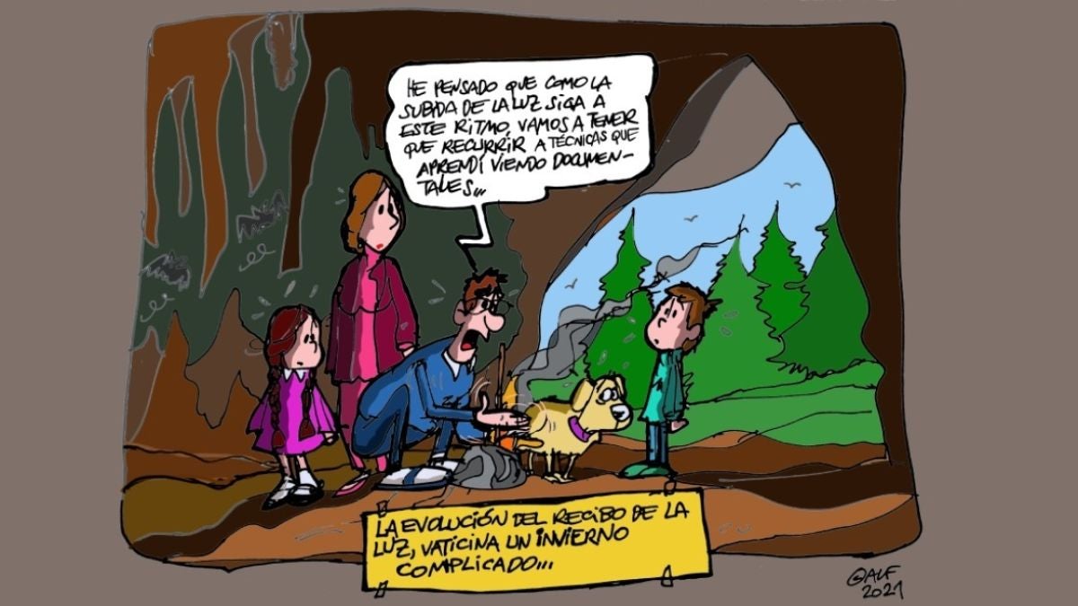 En la viñeta se muestra a una familia cualquiera formada por un padre, una madre, dos niños y un perro metidos en una cueva. El padre intenta ante el asombro del resto de personas hacer fuego frotando un palo como antaño y en la viñeta se puede leer: "He pensado que como la subida de la luz siga a este ritmo vamos a tener que recurrir a técnicas que aprendí viendo documentales".