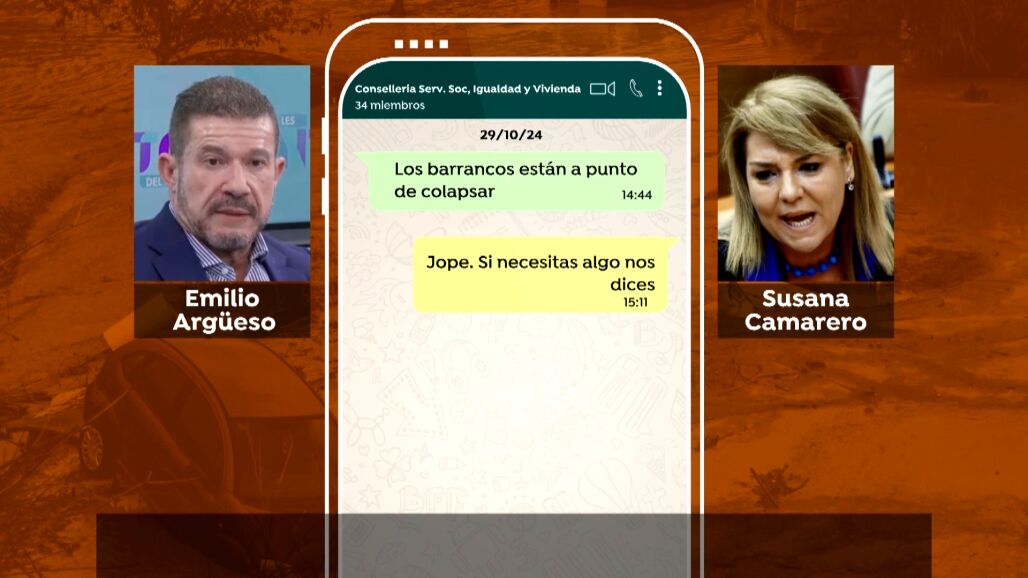 Es parte del informe aportado por la defensa de Argüeso a la jueza de Catarroja que instruye la causa. En ese informe ya se recoge que a mediodía la situación ya es preocupante en los barrancos de la La Ribera. A las 14.44 Argüeso, manda varios mensajes desde Carlet a un chat de la Consellería de Igualdad en el que ya describe que los barrancos crecen mucho de nivel: "Está lloviendo con gran intensidad y con mucho aparato eléctrico". La cosa aquí se está poniendo fea. Los barrancos están a punto de colapsar. Añade que La vicepresidenta de la Generalitat y titular de Servicios Sociales e Igualdad, Susana Camarero, le contesta: "Jopé, si necesitas algo nos dices".