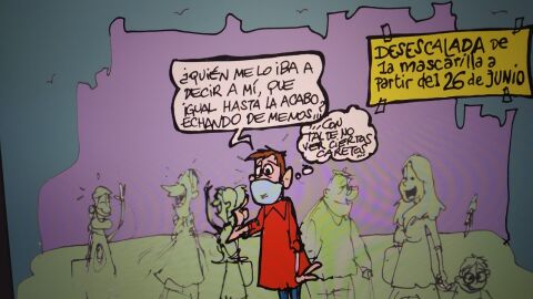 El próximo 26 de junio llegará el fin del uso obligatorio de la mascarilla en exteriores y así lo refleja nuestro ilustrador Alfredo Boto-Hervás en la viñeta de la semana.
