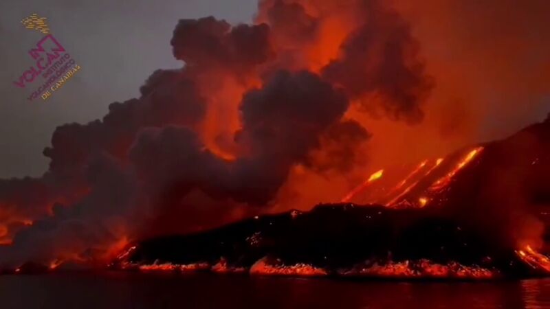 La lava expulsada por el volcán de La Palmaha alcanzado otra vez en las primeras horas de este miércoles, 10 de noviembre, las aguas del océano Atlántico alrededor de la playa de Los Guirres, lugar donde la colada ya creó una fajana anterior a finales de septiembre.