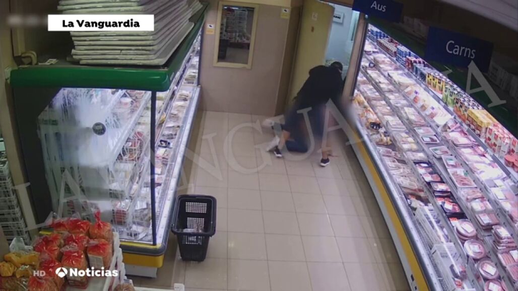 Graban el violento robo con pistola de un hombre en un supermercado de Barcelona