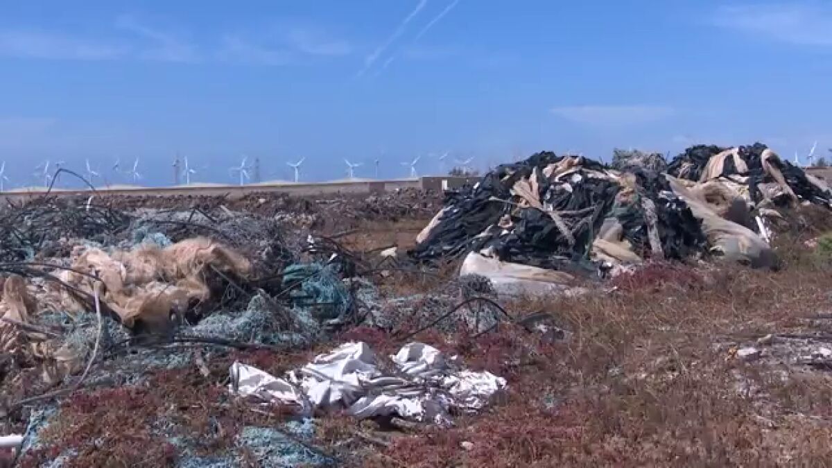 En la zona, algunos invernaderos de tomates, todavía en pie, conviven con estos desechos y con uno de los más importantes parques eólicos de la isla. Porque en la zona sureste, la fuerza y constancia de los vientos han permitido la instalación de molinos que producen energía eléctrica. Energía que representa el 45% del consumo de la comarca, donde viven unas 126.000 personas. Así, mientras se produce energía limpia, los restos de lo que en otro tiempo fue vida dejan una imagen de total falta de respeto por el medioambiente.