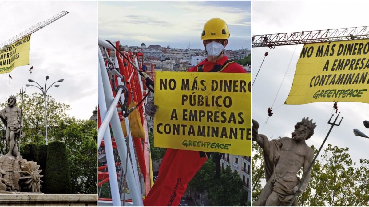 La ONG Greenpeace ha llevado a cabo una acción reivindicativa en el centro de Madrid, desplegando una gran pancarta en una grúa junto a la Plaza de Neptuno, en la que podía leerse 'No más dinero público a empresas contaminantes'.