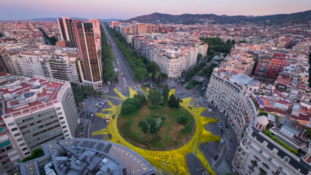 Greenpeace pinta un sol gigante en la plaza Francesc Macià de Barcelona en apoyo a las energías renovables