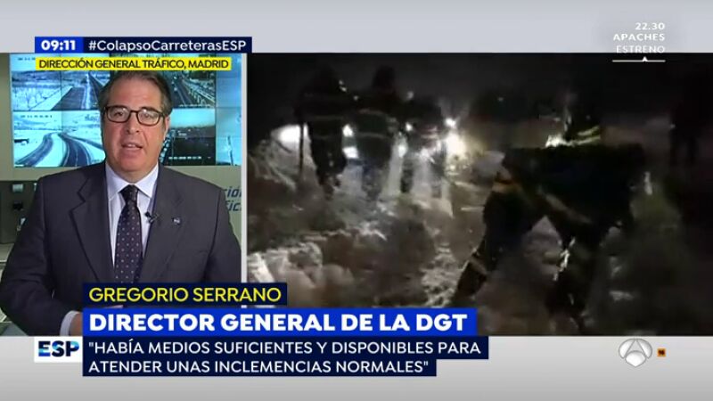 El director general de Tráfico, Gregorio Serrano, ha explicado en una entrevista en Espejo Público que los medios disponibles para afrontar un temporal "son suficientes en condiciones normales", pero indica que cuando hay "una nevada de carácter excepcional unida a una operación retorno de Navidad puede parecer que los medios no son suficientes".
