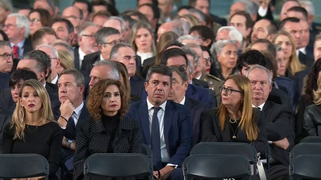 Mientras, en una sala anexa, los Reyes saludaban a los representantes de las víctimas antes de que comenzara el acto. Mazón, que no participó en el saludo a las víctimas, apareció visiblemente consternado por los comentarios, que no cesaron hasta la entrada del rey Felipe VI en la sala, que pidió calma con la mano en el pecho.