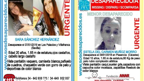 La primera joven, de 15 años, ha desaparecido este martes en Plasencia y la segunda, de 20 años, despareció el pasado día 7 de enero en Los Palacios y Villafranca (Sevilla).