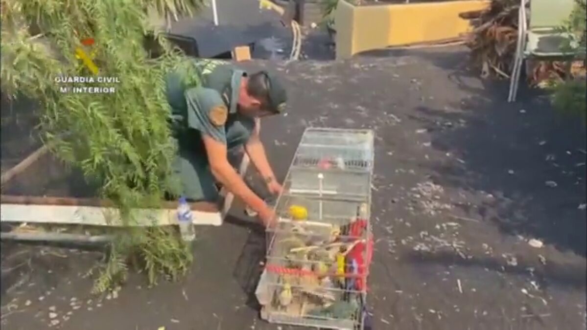 La Guardia Civil ha localizado cerca de Puerto Naos 150 pájaros tropicales en una vivienda en la que ya no se permite el acceso por la cercanía de la colada de lava tras la erupción volcánica de La Palma 2021.