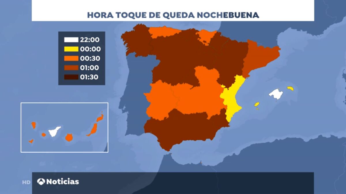 - Cantabria: El toque de queda será en Nochebuena y Nochevieja a las 01:30 horas y el resto de días se mantendrá de 22:00 horas a 06:00 horas. Solo se permitirá la movilidad en los días señalados.