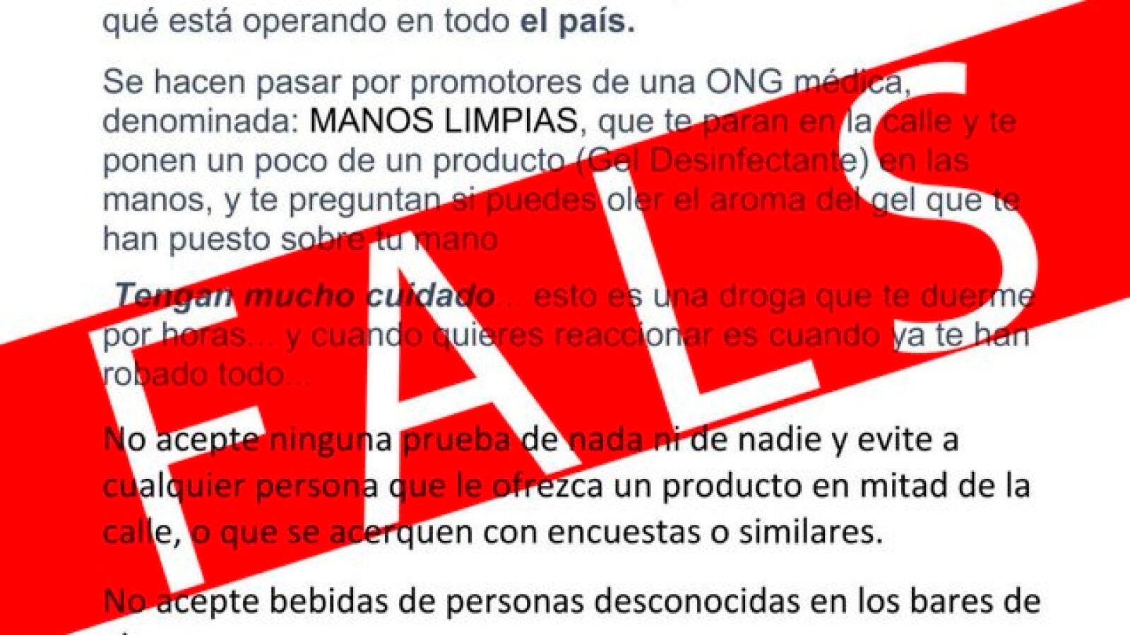 El falso comunicado de la Policía nacional señala que "se hacen pasar por promotores de una ONG médica, denominada 'Manos Limpias', que te paran en la calle y te ponen un poco de producto (gel desinfectante) en las manos, y te preguntan si puedes oler el aroma".