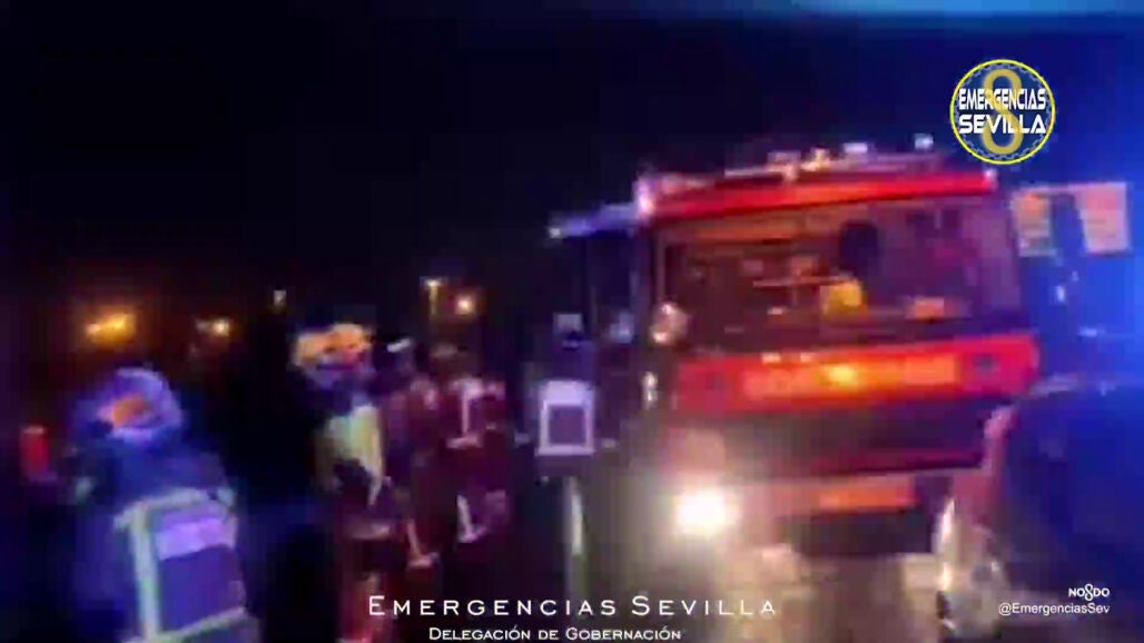 Los agentes de la Guardia Civil también se desplazaron hasta el lugar de los hechos. Las autoridades buscan esclarecer los hechos en la ciudad hispalense después de rescatar a la conductora del coche que tan solo presenta heridas leves tras la colisión con un camión.