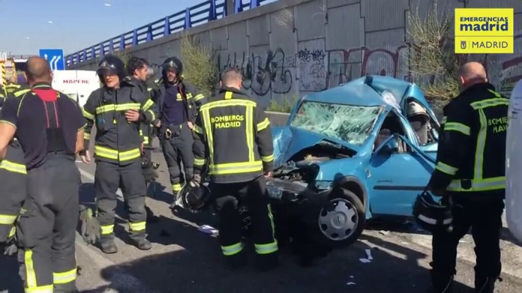 En ese momento, un camión ,que venía por detrás, ha investido al coche; que ha quedado totalmente deformado debido a la fuerza del coche. Al lugar del accidente han acudido los Bomberos del Ayuntamiento de Madrid, que han tenido que rescatar a la familia.