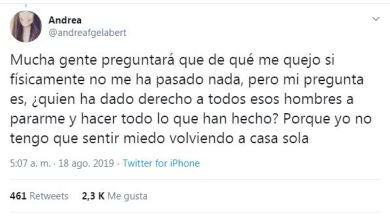 "¿Quién ha dado derecho a todos esos hombres a pararme y hacer todo lo que han hecho? Porque yo no tengo que sentir miedo volviendo a casa sola", lamenta la joven, que no duda en agradecer al conductor del autobús en el que montó por esperarla al verla corriendo.