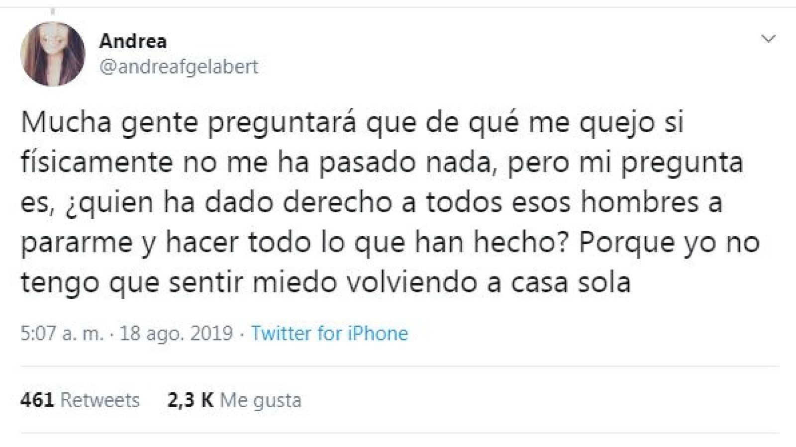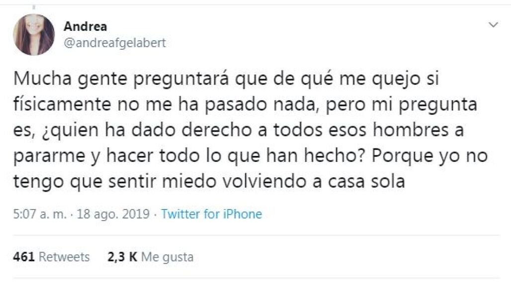 La joven, llamada Andrea (@andreafgelabert) explica que siempre que va a Barcelona deja su coche en la zona universitaria para después coger el transporte público. A modo de contexualización, cuenta que ese día iba vestida con "unos pantalones cortos, una camiseta de tirantes, unas zapatillas y una mochila".