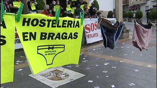 Los hosteleros en Mungia, Vizcaya, se sienten "en bragas". Por eso, han salido a la calle en ropa interior para protestar por las restricciones vigentes contra el coronavirus. El País Vasco es una de las tres comunidades que peores datos epidemiológicos registran por lo que las autoridades han reforzado las medidas sanitarias para luchar contra la pandemia.