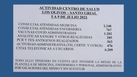 "No podemos más. Esta última semana han aumentado mucho los casos positivos en esta zona y el centro está desbordado. Estamos la mitad de la plantilla, porque parte del personal está de vacaciones y no nos ponen refuerzo de verano, ni tampoco se cubren las bajas de algunos compañeros. Nadie nos hace caso, nos sentimos ignorados", afirma una sanitaria del centro de salud Los Olivos - Santo Grial.