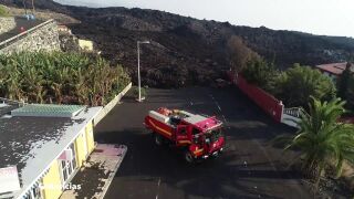 La UME ha accedido hasta el borde de la colada para ver como trascurre el nuevo ramal. En comparación con la altura de un camión de unos tres metros de alto, la altura de la lava a ras de suelo es de dos metros, y la altura de la principal unos 20 metros en este punto.Lo que ahora es un montón de escombros antes era la iglesia, que los vecinos quieren levantar de nuevo. Una finca de plátanos sigue en pie, aunque necesita agua. Otra casa ha conseguido salvarse ya que la lava apenas ha rozado esta esquina.