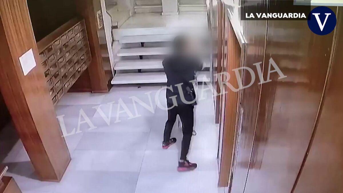 Impactantes imágenes: un hombre atraca a una mujer en el rellano de su bloque en Barcelona