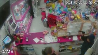 Las empleadas retroceden, y el delincuente comienza a golpear una y otra vez a una de ellas. Las cámaras de seguridad registran la escena desde diferentes puntos de vista. La otra empleada huye, trata de escapar, pero la euforia dura poco porque fuera está esperando un segundo atracador, que le corta el paso empuñando un gran cuchillo.