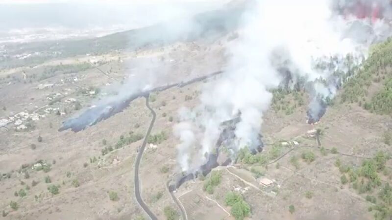 En el vídeo de la noticia puede ver, desde el aire, cómo es la erupción del volcán de La Palma. Se aprecia las cenizas que salen, que son fragmentos de roca muy pequeños originados por la actividad explosiva de un volcán. También se ve en las imágenes del video la carretera y algunas casas cercanas a la zona de la erupción.