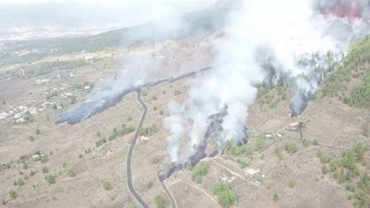 Así se ve el volcán de La Palma en erupción desde este domingo. Las imágenes aéreas ofrecen una vista de la ceniza y algunas viviendas cercanas al volcán.