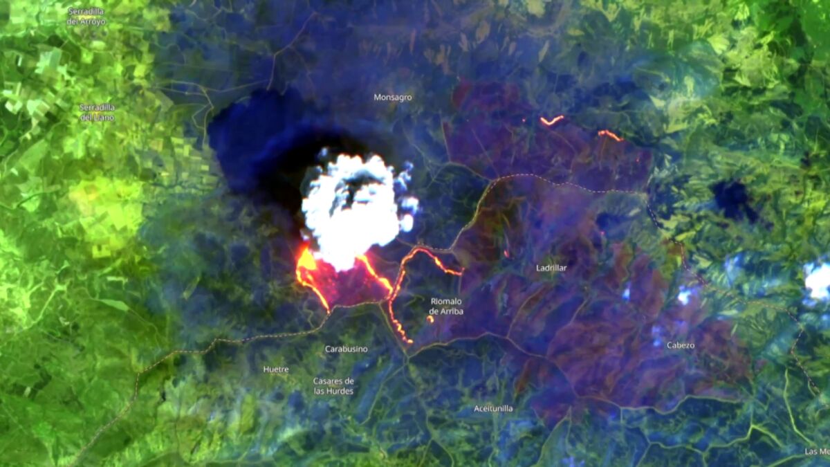 El satélite Copernicus ha capturado unas impresionantes imágenes desde el espacio donde se observa el poder y la extensión de las llamas en la zona de Cáceres y Salamanca.