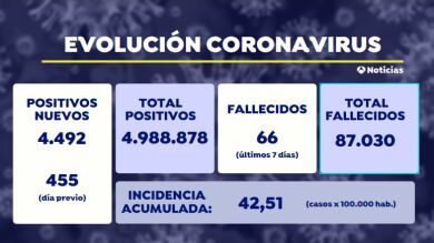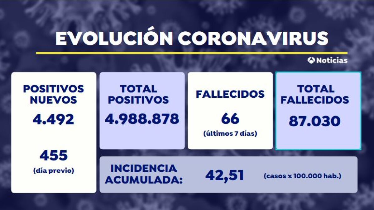 La cifra total de contagios en España se eleva ya a 4.988.878 desde el inicio de la pandemia y la de fallecidos a 87.030.