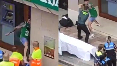 El vídeo del suceso ha sido compartido en Twitter por la cuenta 'Social Drive', que informa de las diversas incidencias en las carreteras y calles españolas. En la grabación, se puede apreciar al individuo, que llevaba una camiseta de baloncesto y unos pantalones azules, propinándole una patada fortísima a un agente en la entrada de una sucursal de 'Caja Rural' del mencionado municipio.