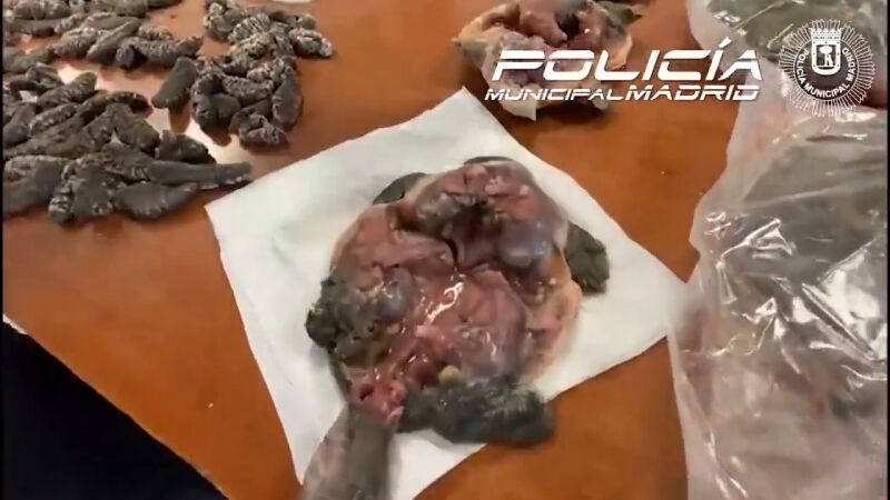 Caparazones de tortugas, pepinos de mar, cangrejos americanos y más de 9.600 medicamentos sin control, entre lo encontrado por los agentes en este restaurante de Madrid.
