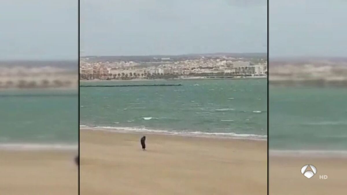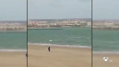 En esas imágenes, que duran 52 segundos y están siendo difundidas desde el domingo por redes sociales y a través de mensajes instantáneos de teléfonos móviles, se ve a un hombre que apenas podía mantenerse en pie, en medio de la playa, en la arena, mientras se registraba un fuerte vendaval.