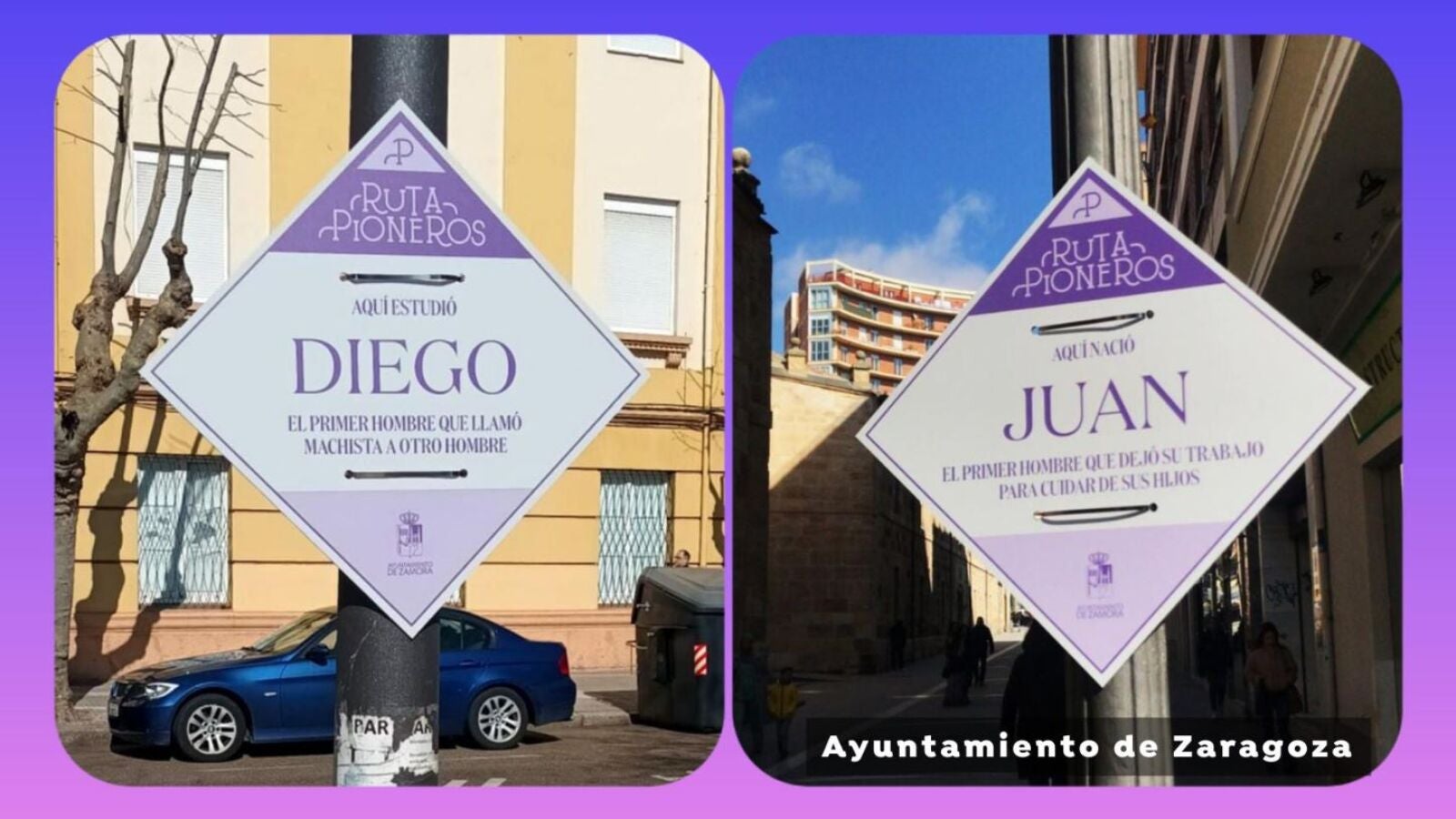 "Aquí estudió Diego, el primer hombre que llamó machista a otro hombre". Y "Julián, el primero que no se giró cuando pasó una mujer con minifalda". Otro cartel señala el lugar donde trabajó "Samuel, el primer hombre que no se rio de un chiste machista" y "Manolo, que fue el primero que se hizo la cena solo". Carteles que forman parte de la 'Ruta de los Pioneros', un itinerario ficticio por el centro de la ciudad de Zamora y que ha propuesto el Ayuntamiento para celebrar este 8 de Marzo.