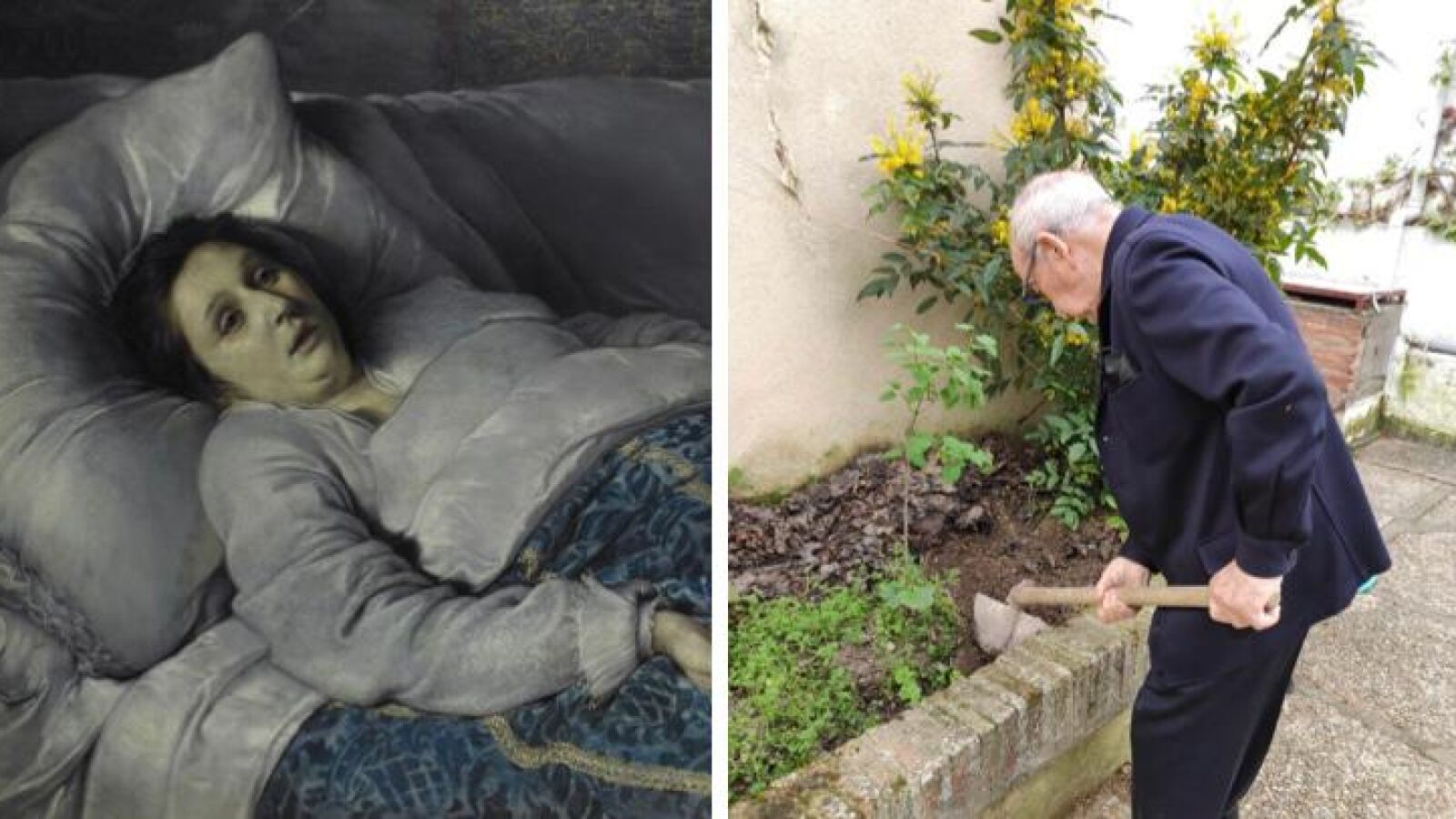@CarmenVcello ha colgado en su perfil de Twitter un montaje con dos imágenes para apreciar lo que ella califica de "verdaderos" efectos de la vacuna contra el coronavirus. A la izquierda se puede ver una pintura de una mujer recostada en una cama con aspecto de estar moribunda y que sirve a la joven para ironizar sobre cómo se encontraba ella misma tras recibir la vacuna contra el COVID-19. A la derecha como si fuera un meme se ve a su abuelo en plena forma, azada en mano arreglando su huerta después de haber recibido la segunda dosis.