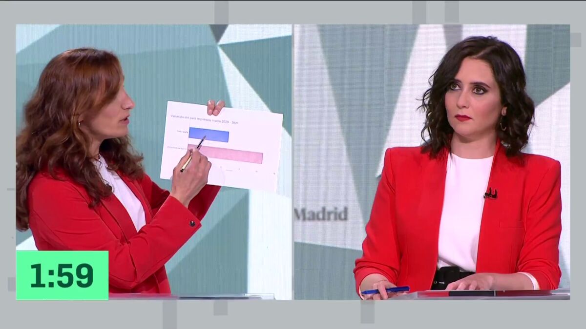 La candidata del Partido Popular, Isabel Díaz Ayuso, ha exigido varias veces a la candidata de Más Madrid, que le diga la fuente dónde ha extraído los datos del paro de España y de la Comunidad de Madrid que ha mostrado durante el debate para las elecciones en Madrid.