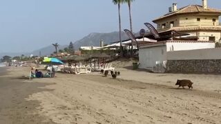 A plena luz del día, los jabalíes se están acercando a las costas de España. Uno de los lugares que han elegido estos últimos días ha sido la playa de Marbella, uno de los lugares favoritos para el turismo humano... y al parecer también para el turismo animal. Cuando ya no quedan más cultivos que arrasar, los animales avanzan en busca de comida y pueden alcanzar el centro de las ciudades o la playa, como es este caso.
