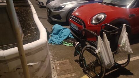 Lleva 15 días en la calle. Pedro tiene una discapacidad del 88% causada por un ictus en 2018 y va en silla de ruedas.