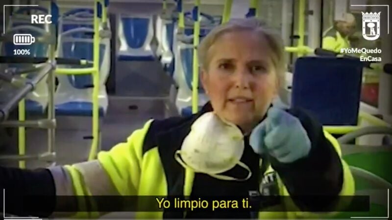 La protagonista del vídeo, una trabajadora de la EMT, desinfecta cada día los autobuses urbanos de Madrid. Como ella, son miles las personas anónimas que están trabajando para que la capital y todas las ciudades españolas puedan seguir funcionando en el estado de alarma decretado por la pandemia del coronavirus.