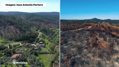 La desoladora imagen del antes y el después del incendio en Almonaster la Real (Huelva)
