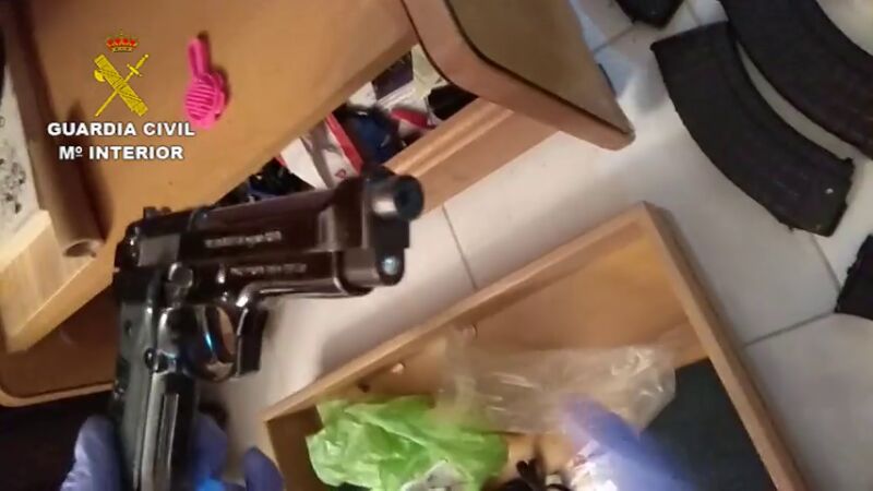 Se han intervenido 2 fusiles AK47 con culata retráctil sin marca ni número de fabricación; 12 cargadores aptos para estos fusiles; 2 silenciadores acoplables; 1 arma corta simulada; 1 silenciador para un arma calibre 10 mm; 2 cargadores, uno para un arma calibre 10mm y otro para un arma calibre 22mm; 5 grilletes metálicos y cerca de 800 cartuchos, tanto para los fusiles localizados como para alimentar varias armas de fuego diferentes. Todas las armas carecen de marca, modelo y punzones de fabricación.