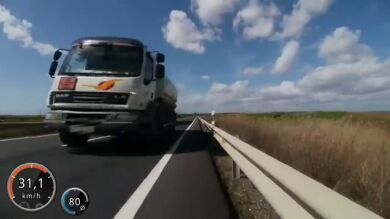 Así ha vivido un ciclista el momento en el que un camión invade el carril contrario y pone en grave peligro su vida. El ciclista circula por una carretera en Huelva cuando el vehículo articulado, en una temeraria maniobra de adelantamiento, invade el carril contrario.