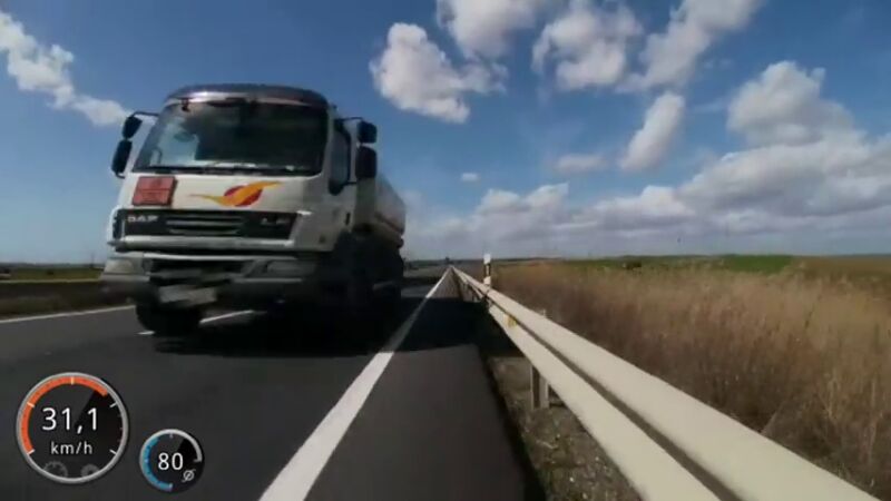 El ciclista, ante la ausencia de arcén, solo es capaz de reducir la velocidad y hacer señales con los brazos para advertir al camionero de su presencia. Sin embargo éste ignora las señales y continúa con el adelantamiento hasta pasar muy cerca del ciclista que a duras penas puede mantener el equilibrio.