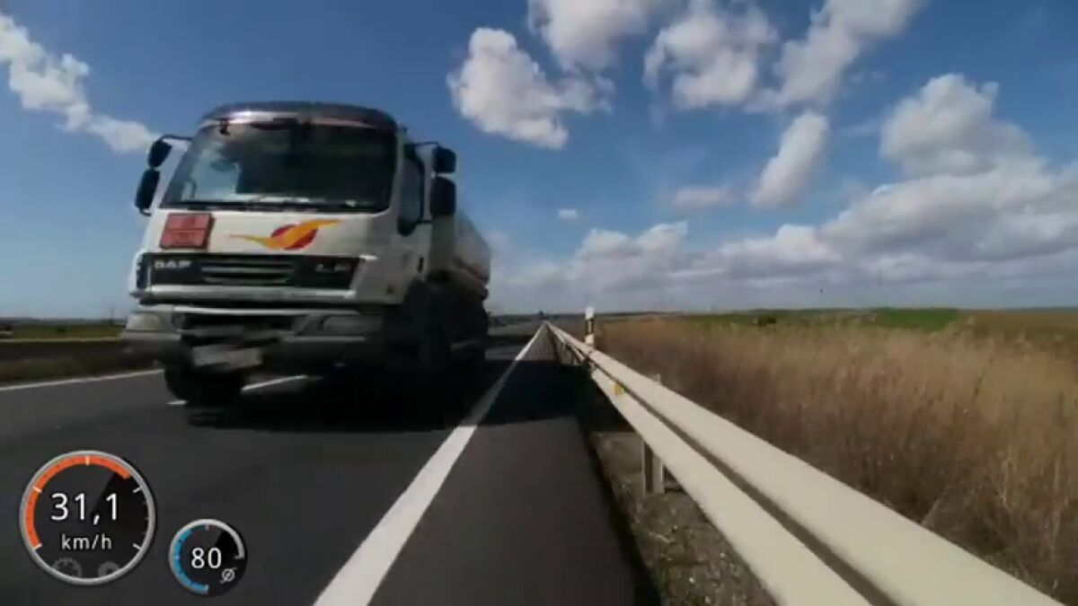 En la carretera que une la Palma del Condado y Valverde del Camino, en Huelva, un ciclista circula con normalidad. De lejos, comienza a ver que dos camiones se acercan a su posición. Uno de ellos realiza una maniobra de adelantamiento muy peligrosa invadiendo el carril contrario.